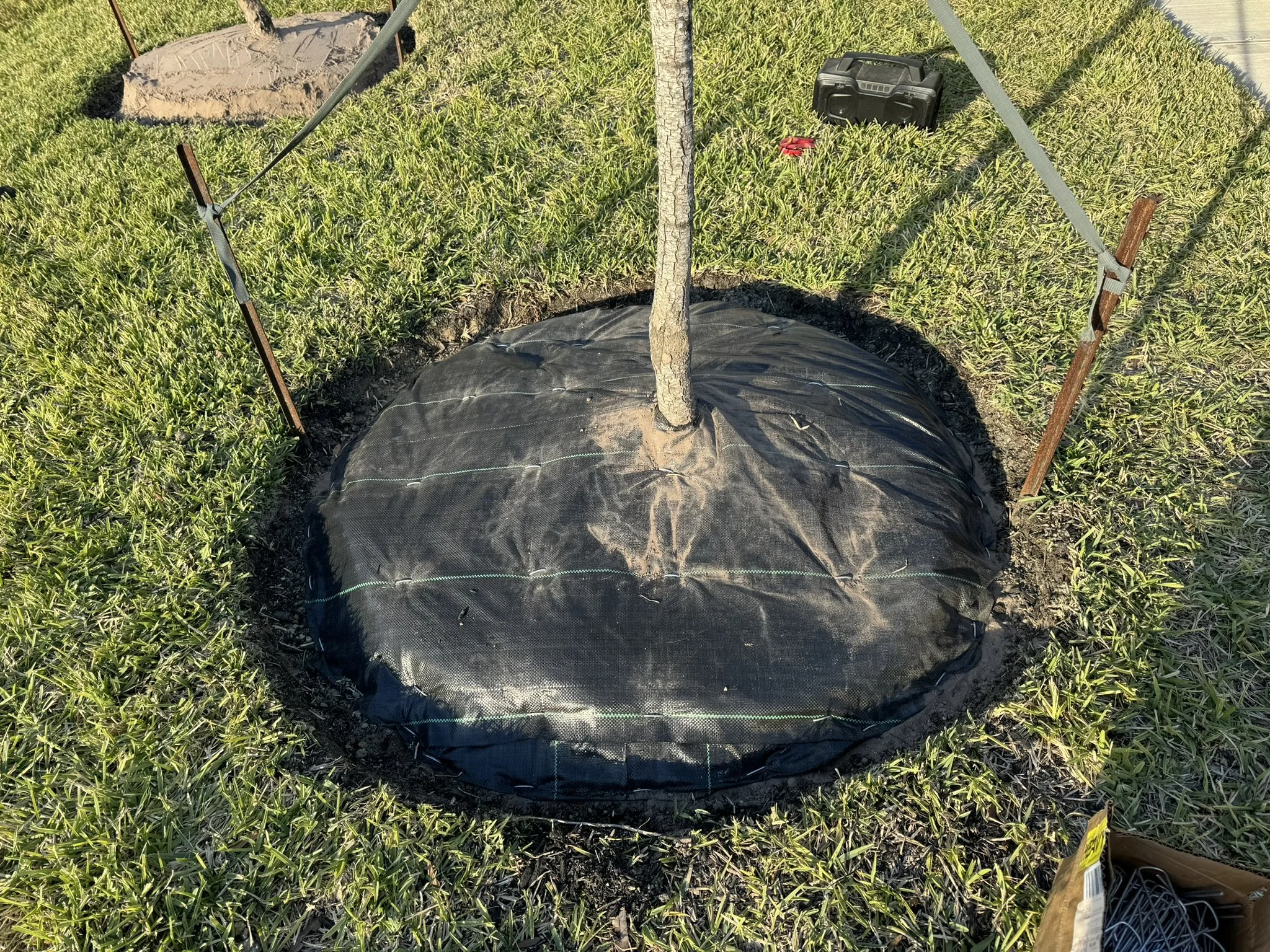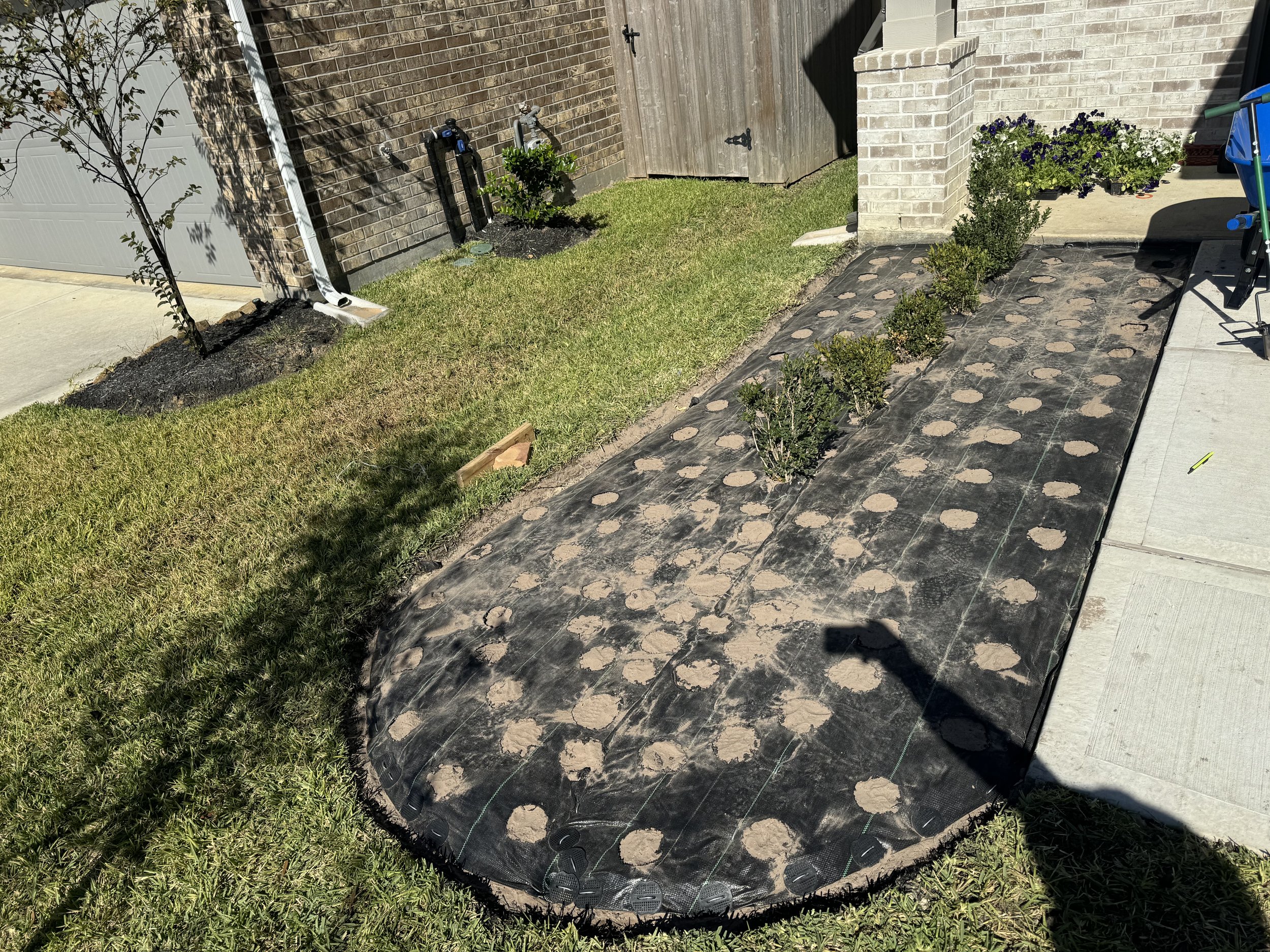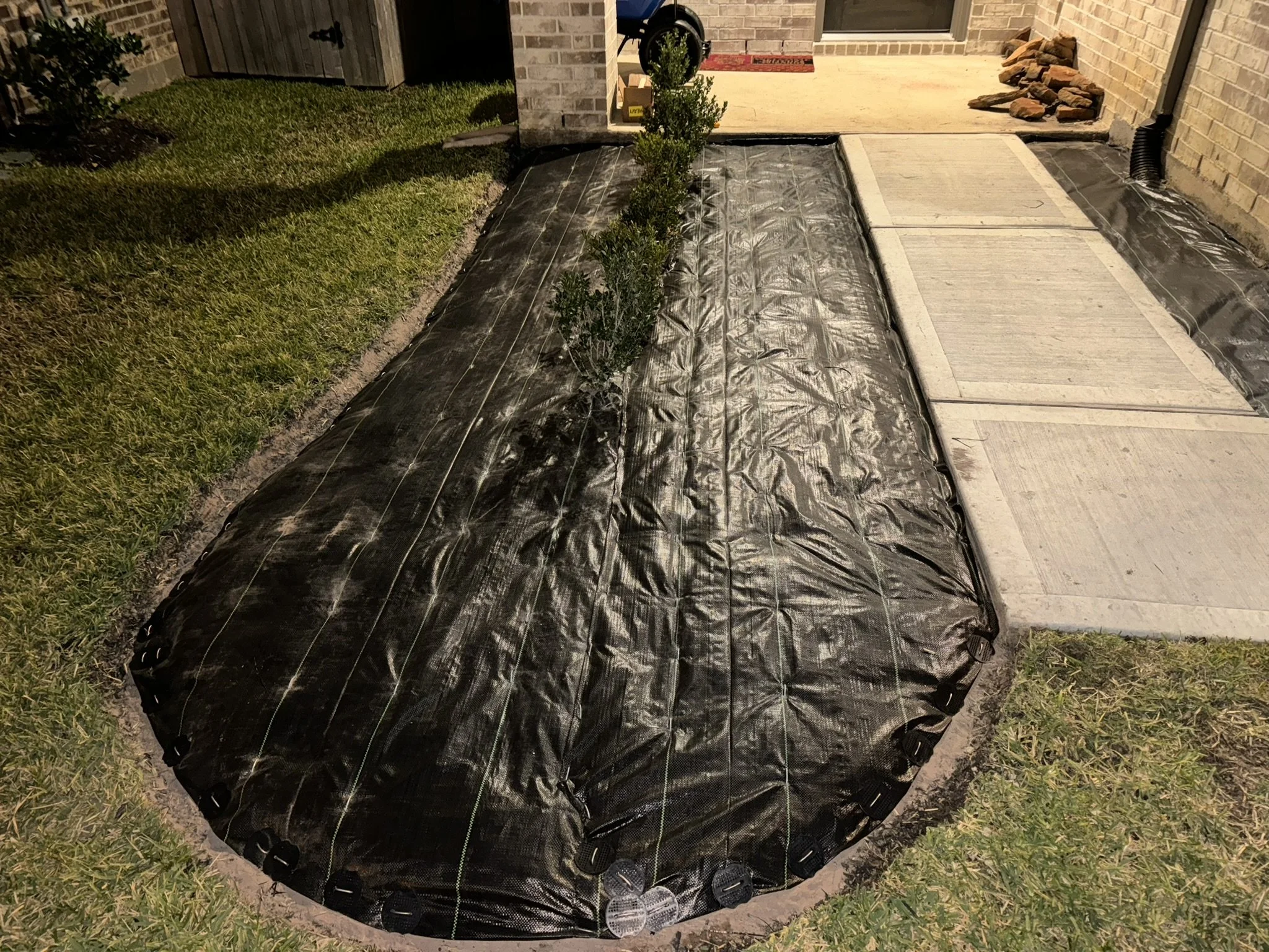 Commercial-grade 3MM UV weed barrier installed with staples and gaskets to keep weeds away while allowing water to pass through to the plant roots for proper hydration.
