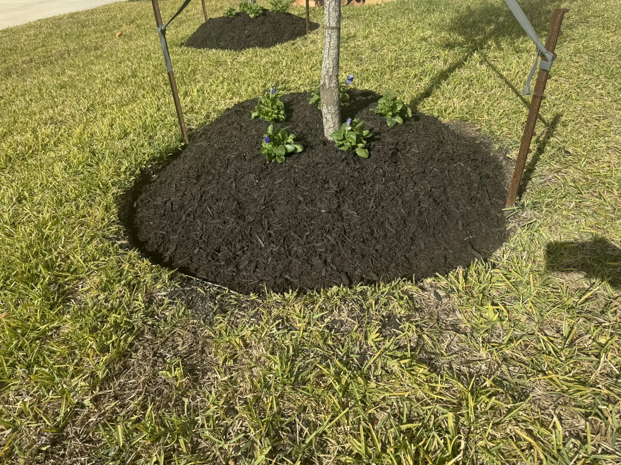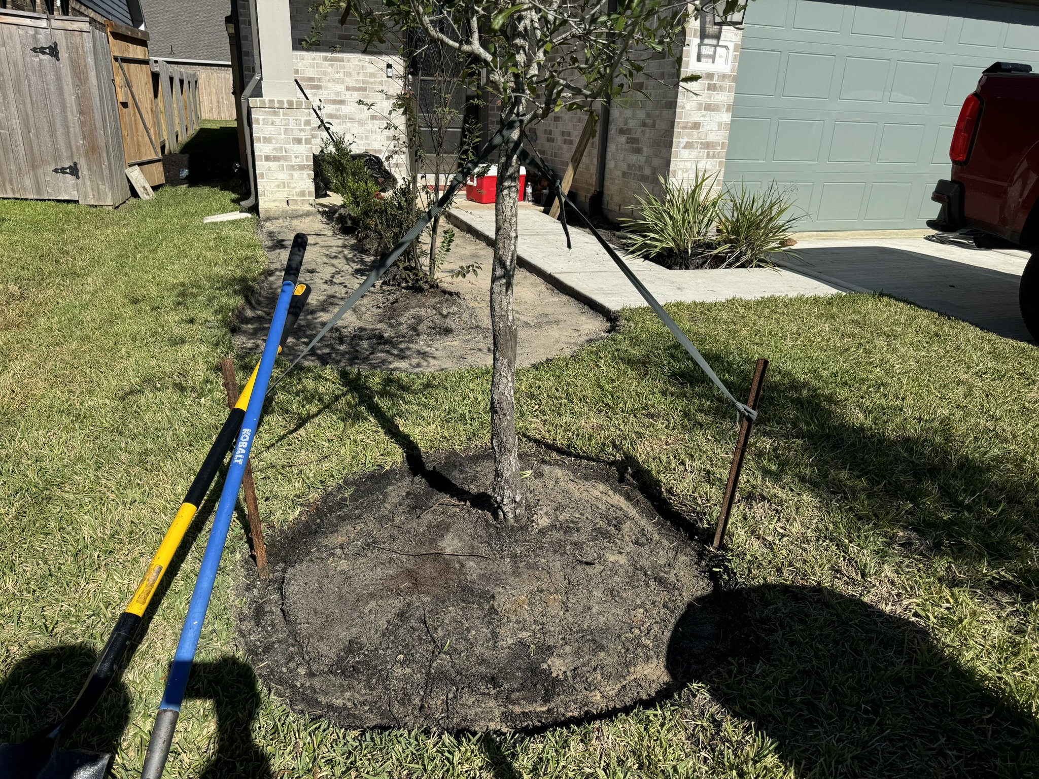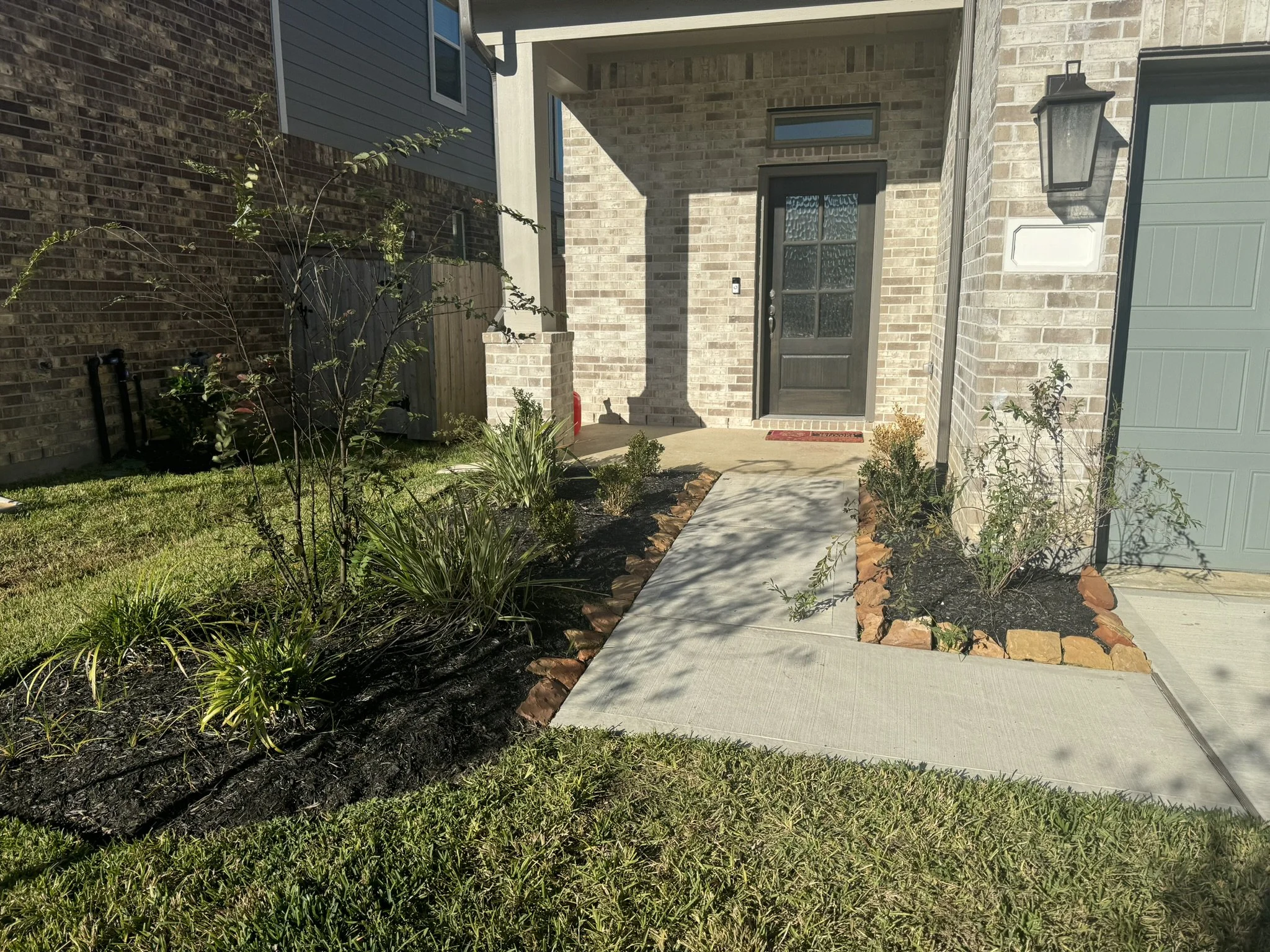 We removed the original mulch, and the construction debris left by the builder inside the soil as well as a couple of inches of hard clay. We backfilled with native garden soil to ensure the new plants can thrive.